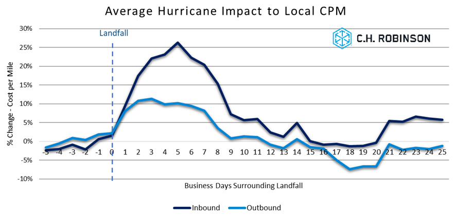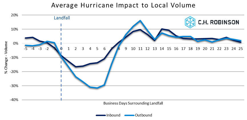 While disruptions such as hurricanes can be impactful to contractual freight, the impacts are mostly felt on sparse lanes and during the most severe storms. Performing to the initial plan is something that is advantageous to all parties involved, so having a plan in place for these disruptions will greatly improve your ability to navigate the challenges at hand and minimize interruptions to your supply chain. Having a contingency plan will also assist in staying on track to budget. Talk to your C.H. Robinson account team about how they can help you create a plan to manage through known events such as holidays and unforeseen events such as hurricanes.