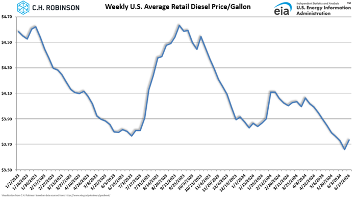 Retail diesel's national USA average price per gallon of $3.82 in May is down from $4.00 in April, and still lower than the $3.92 average from May 2023.  As depicted in the visual below, created based on the data provided by the EIA, you can see that fuel has been decreasing in the back half of April and into May.  Diesel pricing continues to decrease, most recently getting down to levels not seen in 2 and a half years.