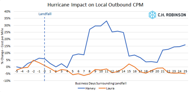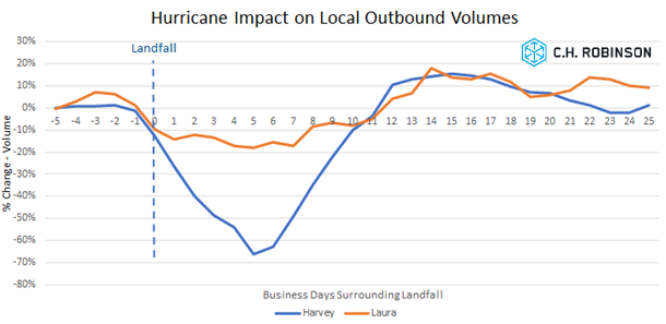 Hurricanes Harvey (2017) and Laura (2020) were both Category 4 storms that struck the Gulf Coast of the United States 3 years apart, with only 350 miles separating their landfall locations. While Harvey's path and rotation had a major impact on the metropolitan areas of South Texas, Laura's impact to major economic zones was less severe. Additionally, freight markets were somewhat similar in the summers of 2017 and 2020, with both years in recovering conditions coming out of a freight market lull. This example shows that even events with similar characteristics can impact freight markets in different ways, with a key consideration being the economic areas impacted by landfall and the path the storm takes.